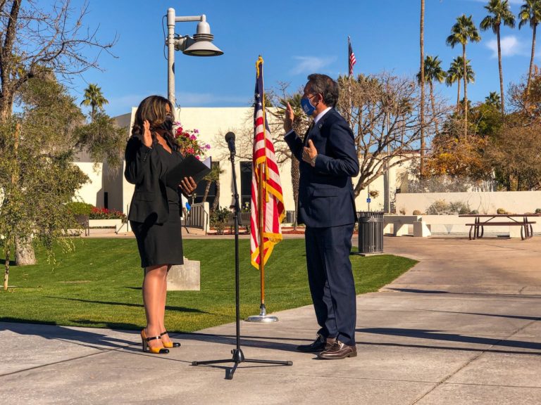 (INDEPENDENT NEWSMEDIA/ARIANNA GRAINEY) By Melissa Rosequist | Scottsdale Independent Just after 2 p.m. Jan. 12, Scottsdale’s four newly-elected leaders took the oath of office to represent their beloved