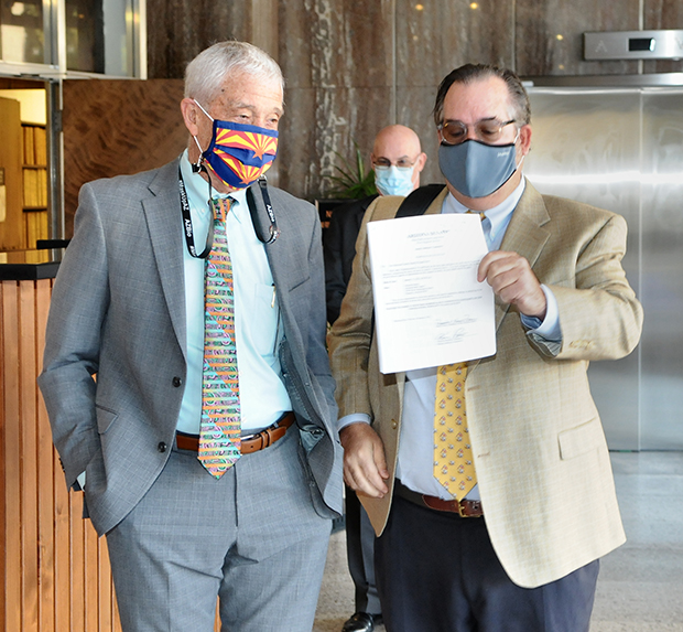 Jack Sellers, left, chairman of the Maricopa County Board of Supervisors, and Deputy County Attorney Tom Liddy show up at the Senate Wednesday morning after