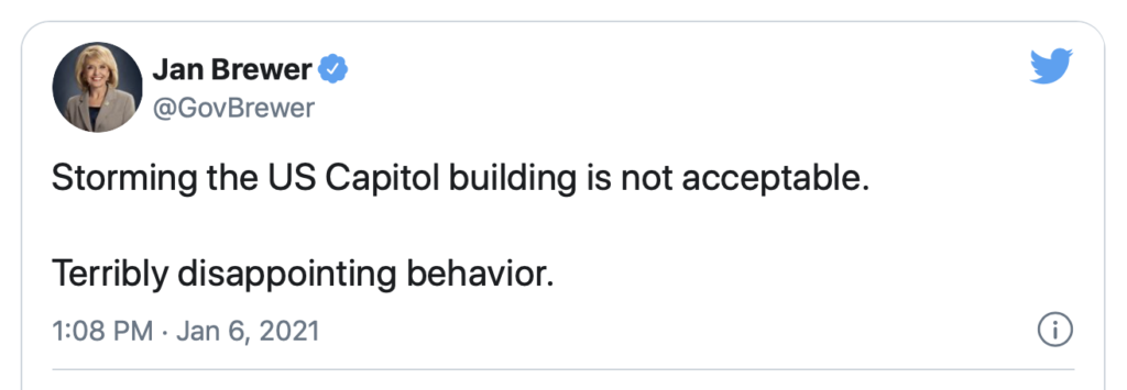 “In America, we practice peaceful transitions of power. We respect the law and law enforcement,” Ducey tweeted. “The scene at the United States Capitol right now is wrong and has no place in our form of government. All should denounce, and it should end now.”