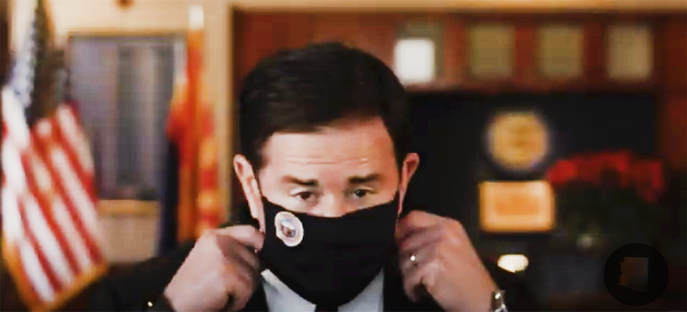 Governor Doug Ducey prepares to unmask to deliver his State of the State address Monday from his office at the Capitol./Arizona Capitol TV