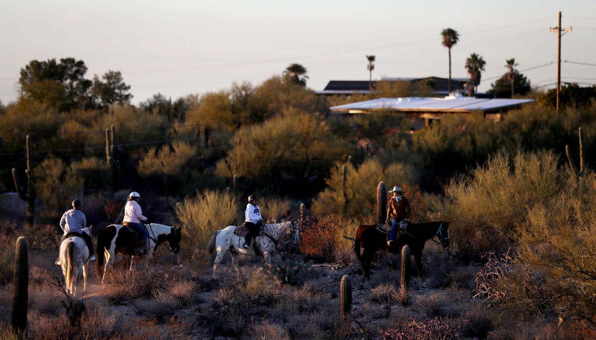 Riders meander along a ridge between two washes on the sunset trail ride in the open land west of Westward Look. The historic resort’s developers want to usher in apartments, casitas, restaurants, shops and a hotel. | Kelly Presnell / Arizona Daily Star