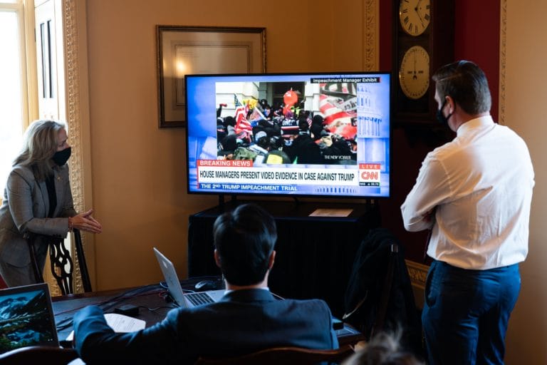The House impeachment managers including Representative Madeleine Dean of Pennsylvania, left, watch the proceedings on the trial’s first day. /Credit…Erin Schaff/The New York Times By