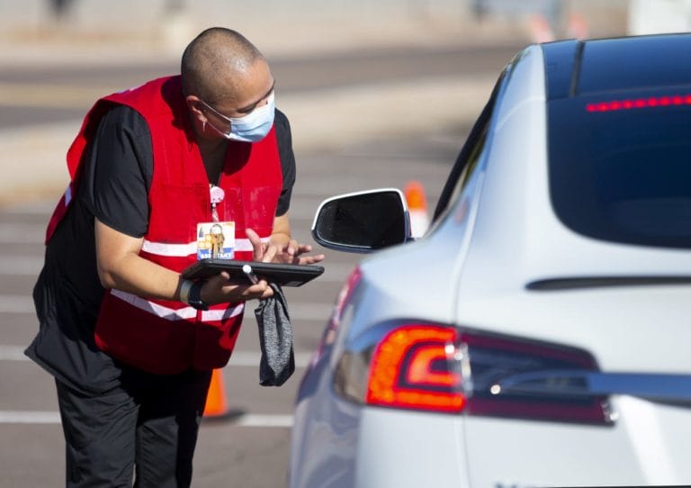 Dignity Health medical assistant Lisa Keeney, signs in a patient for their COVID-19 vaccination at Dignity Health’s county POD site at Chandler-Gilbert Community College on