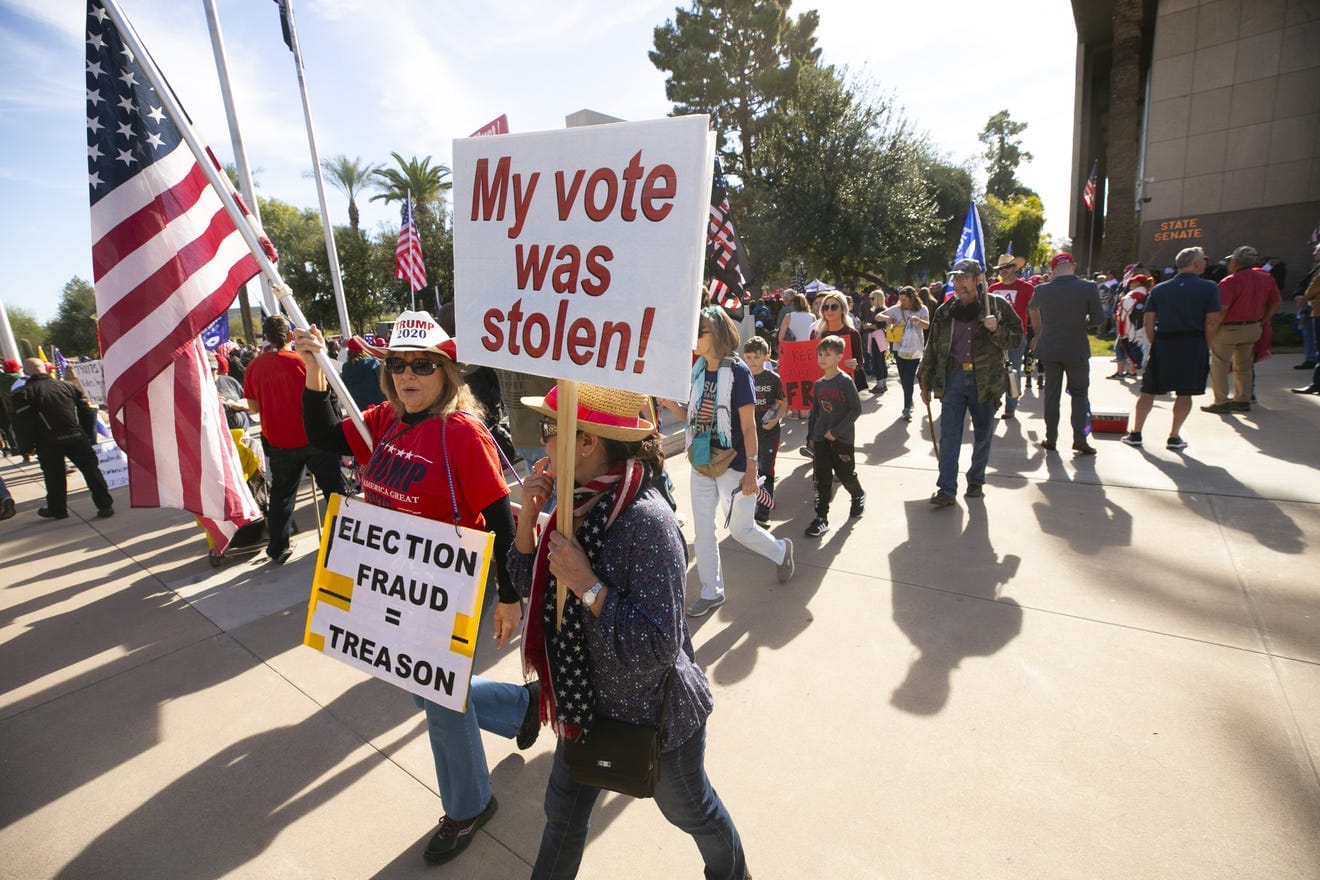 People participate in a pro-Trump rally at the state Capitol in Phoenix, as the U.S. Congress meets in Washington, D.C., to certify the results of the presidential election, on Jan. 6, 2021./Arizona Republic