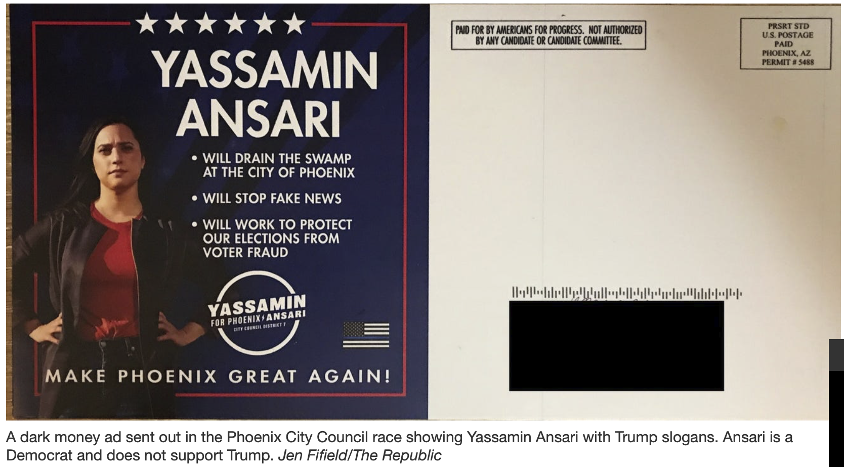 The ads, featuring Donald Trump’s talking points, are seemingly attempting to trick voters in the heavily progressive district into thinking that Yassamin Ansari, a Democratic candidate for Phoenix City Council, is a Republican.