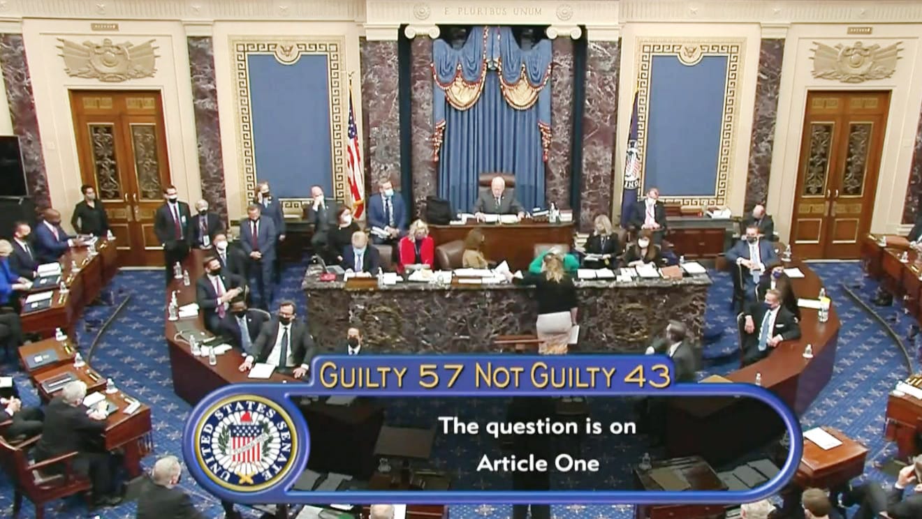 The Senate’s decision to acquit former President Donald J Trump appears during the second impeachment trial of former President Donald Trump in the Senate on Feb 13, 2021./Handout, Senate Television via USA TODAY NETWORK