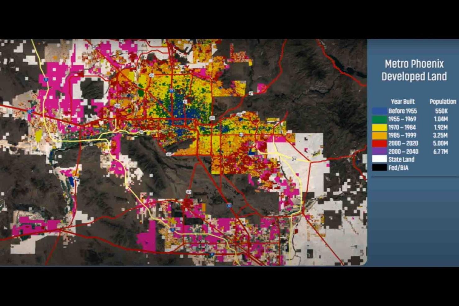 The various colors in this map represent the history of home-building patterns in the Valley for more than 50 years. The deep purple spots indicate future areas for development. (Land Advisors Organization)