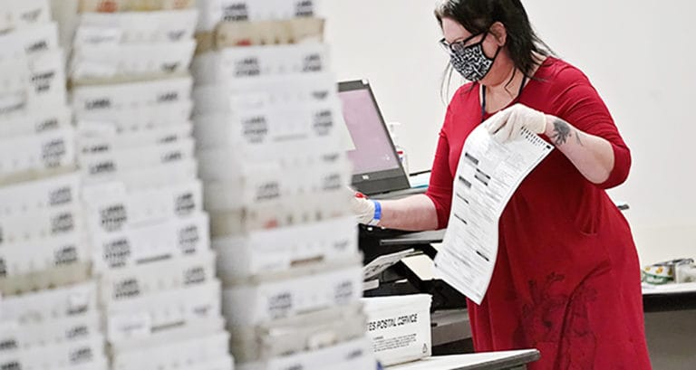 In this November 6, 2020, photo, Arizona elections officials continue to count ballots inside the Maricopa County Recorder’s Office in Phoenix. The Arizona Senate got