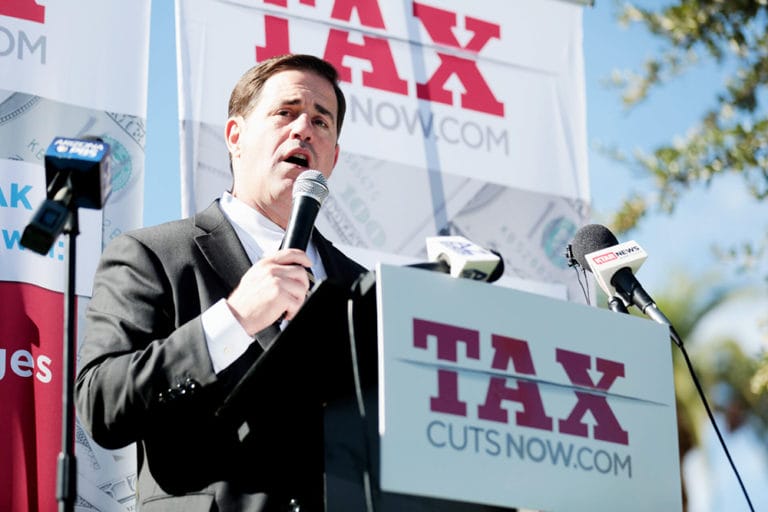 Gov. Doug Ducey speaking with attendees at a “Tax Cuts Now” rally on Nov. 6, 2017. /Photo by Gage Skidmore / Flickr/CC BY-SA 2.0 By