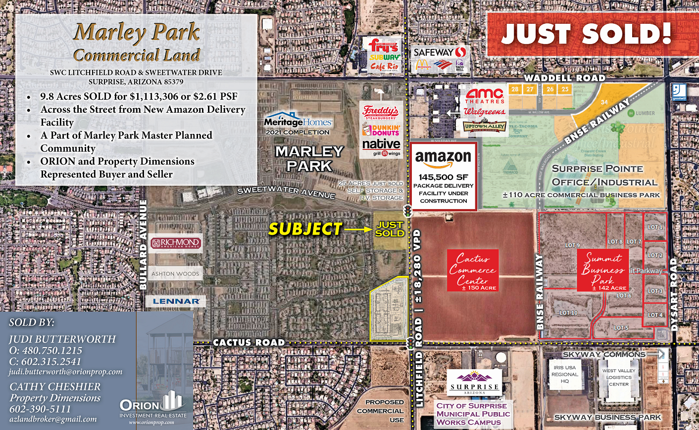 Judi Butterworth commented on the land transaction, “This prime Surprise commercial parcel has a wide range of zoning options—from retail to business park, medical to flex buildings. With all arterials fully improved, this property is ready for development.”