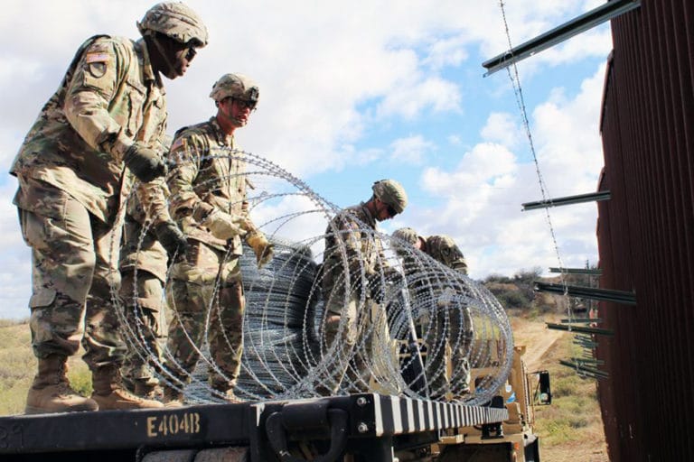 Engineers from 937th Clearance Company prepare to place concertina wire on the Arizona-Mexico border wall, Dec. 1, 2018./COREY MAISCH/U.S. ARMY By Howard Fischer | Capitol