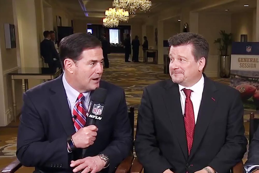 Governor Ducey with Bill Bidwill Jr announcing the 2023 Super Bowl will be played in Cardinals Stadium./NFL