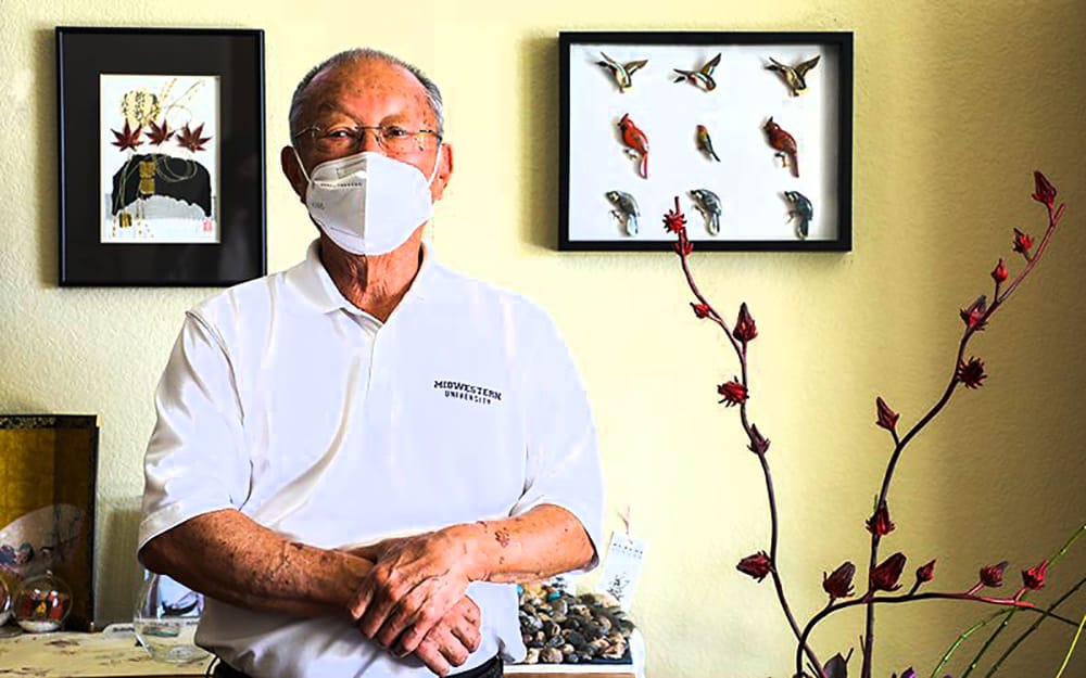 Dr. Richard Matsuishi was 4 when his family was displaced from their California home in 1942 and sent to an internment camp near Parker. He poses here in his Sun City home next to birds his parents handcrafted while imprisoned. /Photo by Alina Nelson/Cronkite News