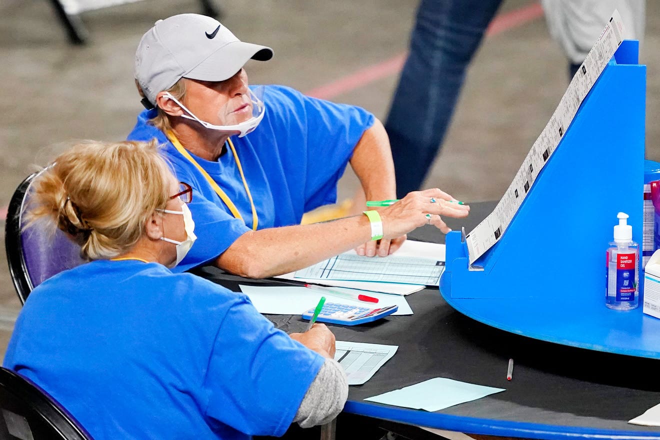 Maricopa County ballots cast in the 2020 general election are examined and recounted by contractors working for Florida-based company, Cyber Ninjas, Thursday, May 6, 2021, at Veterans Memorial Coliseum in Phoenix./Matt York/AP