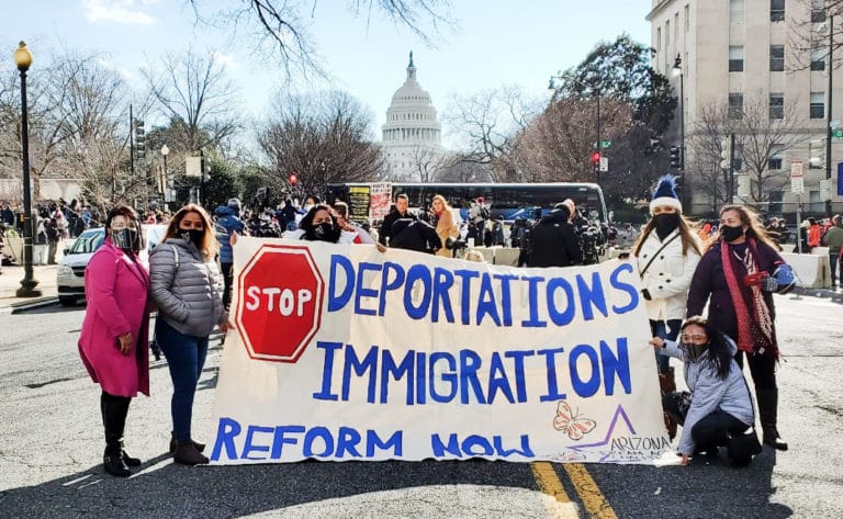 A group of members with the Arizona Dream Act Coalition holds a banner that says, “Stop Deportations. Immigration Reform Now” in Washington, D.C. on Jan.