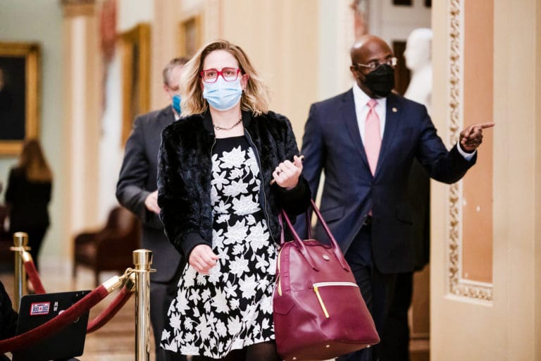 In this Feb. 9, 2021, photo Sen. Kyrsten Sinema, D-Ariz., and Sen. Raphael Warnock, D-Ga., right, arrive as the second impeachment trial of former President