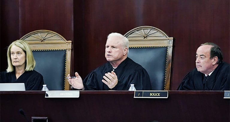 Arizona Supreme Court Chief Justice Robert M. Brutinel, center, speaks during oral arguments, Tuesday, April 20, 2021, in Phoenix as Vice Chief Justice Ann A.