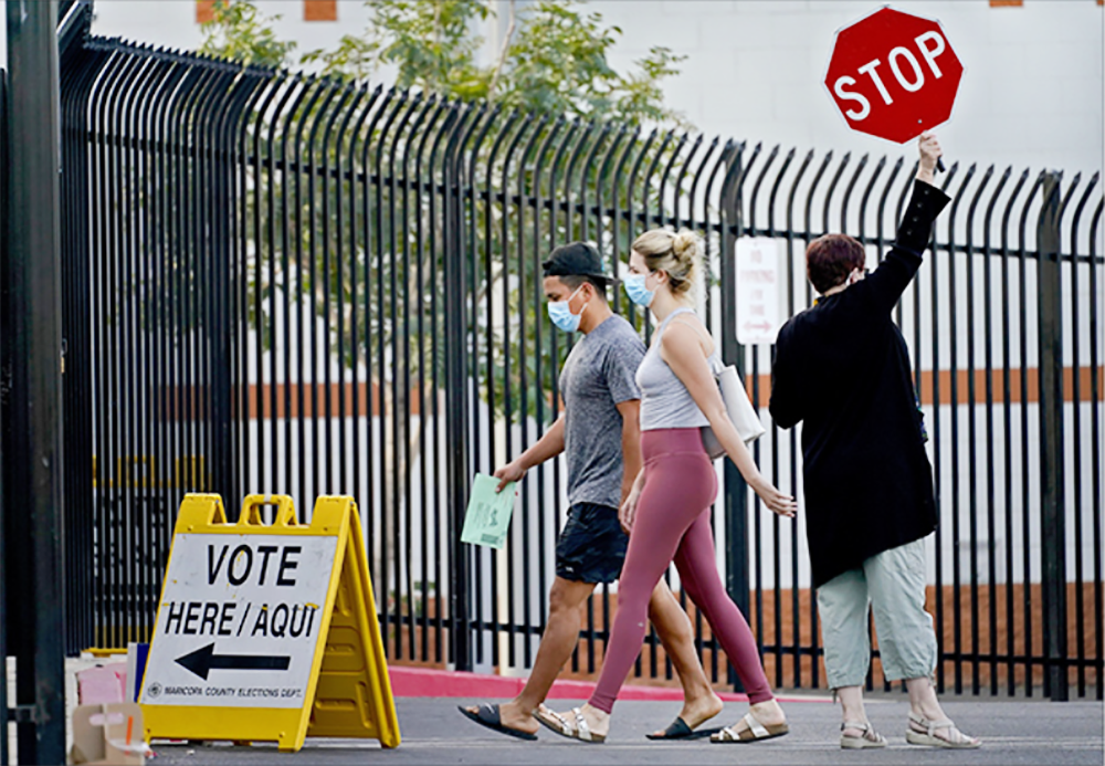 A school crossing guard stops cars for voters entering a polling station, Tuesday, Nov. 3, 2020, in Phoenix. /AP Photo/Matt York