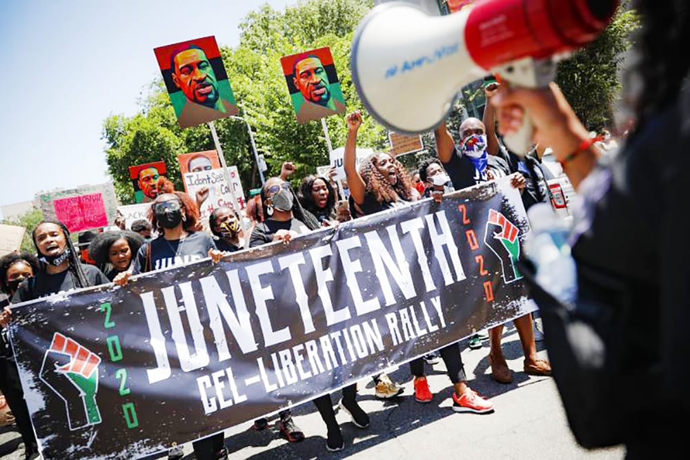 FILE- In this June 19, 2020, file photo, protesters chant as they march after a Juneteenth rally at the Brooklyn Museum, in the Brooklyn borough of New York. /AP Photo/John Minchillo