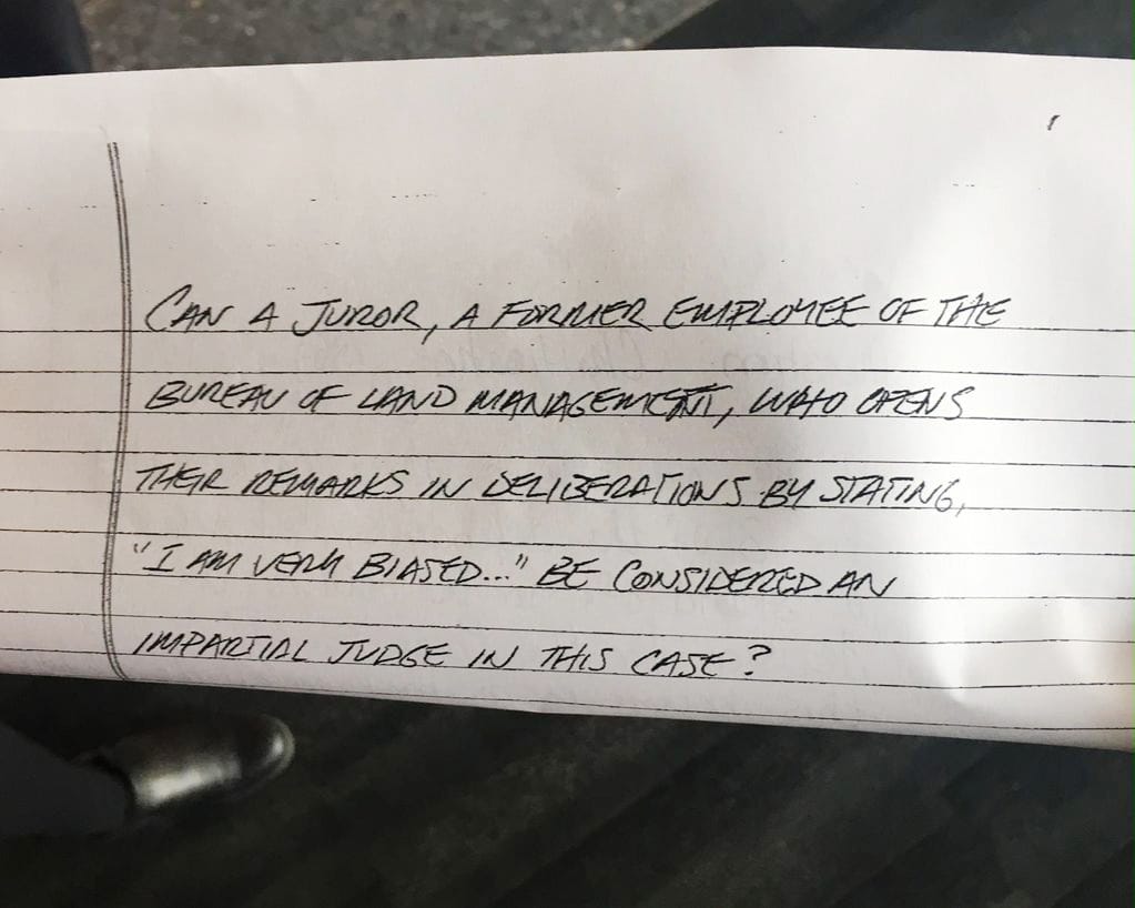 In a note to U.S. District Judge Anna Brown, the jury raised questions about the impartiality of one of its members. Brown has sent a note back to the jury asking them for clarification. / Amelia Templeton / OPB