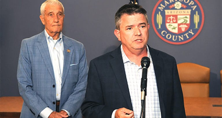 Maricopa County Supervisor Bill Gates answers questions Monday about the board’s decision not to respond to the latest Senate subpoena. With him is Chairman Jack