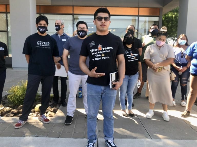 Jesus Vazquez speaks on Sept. 20, 2021, outside of Sen. Mark Kelly’s office in Phoenix to push the Democrat to secure a pathway to citizenship