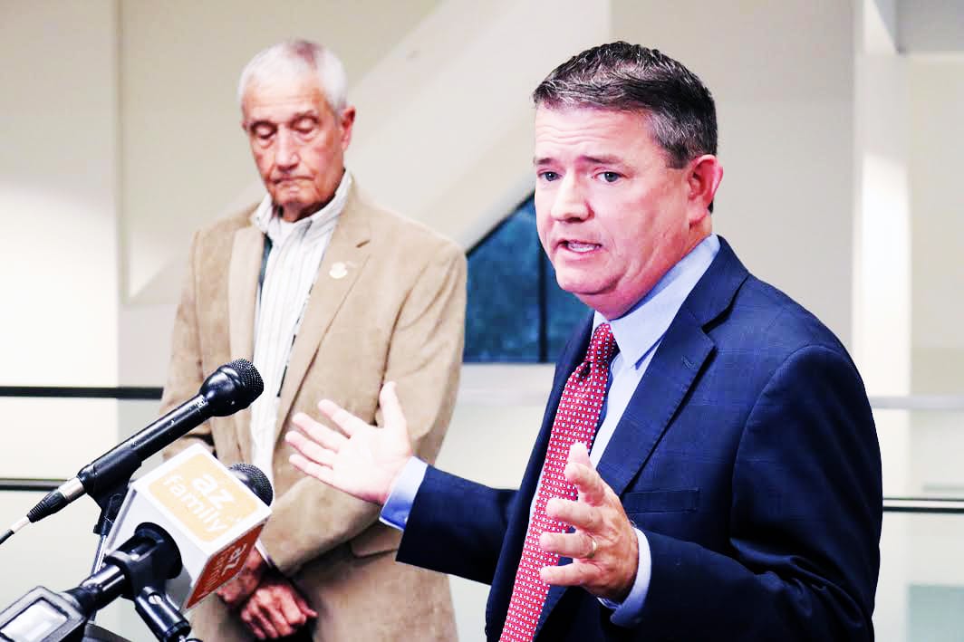 Bill Gates, a member of the Maricopa County Board of Supervisors, stands at the podium with board chairman Jack Sellers in the background after the board approved a settlement agreement with the Arizona Senate related to the county’s routers on Friday, Sept. 17, 2021.