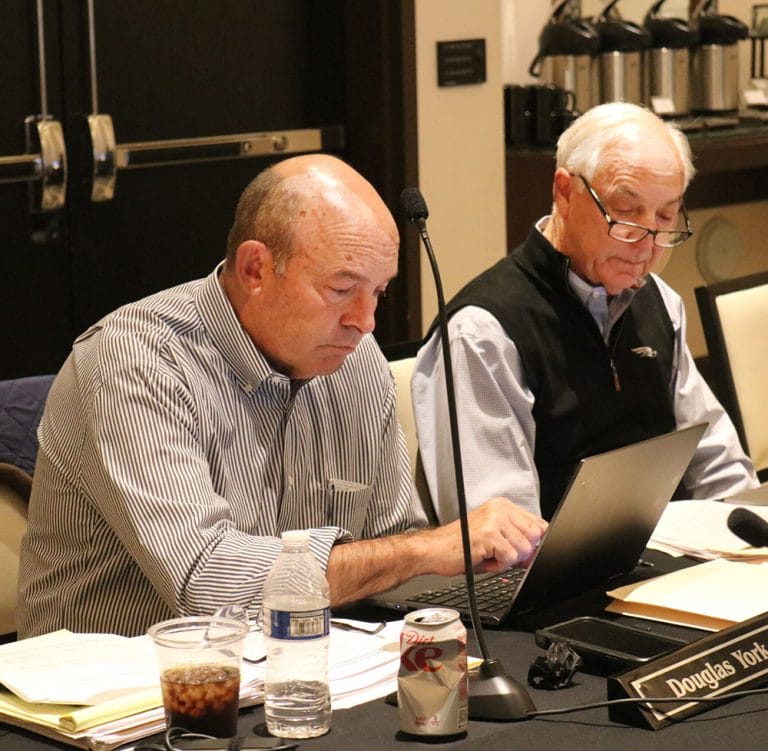 Republican redistricting commissioners Doug York (L) and David Mehl (R) listen during an Arizona Independent Redistricting Commission meeting on Dec. 13, 2021. /Photo by Jeremy