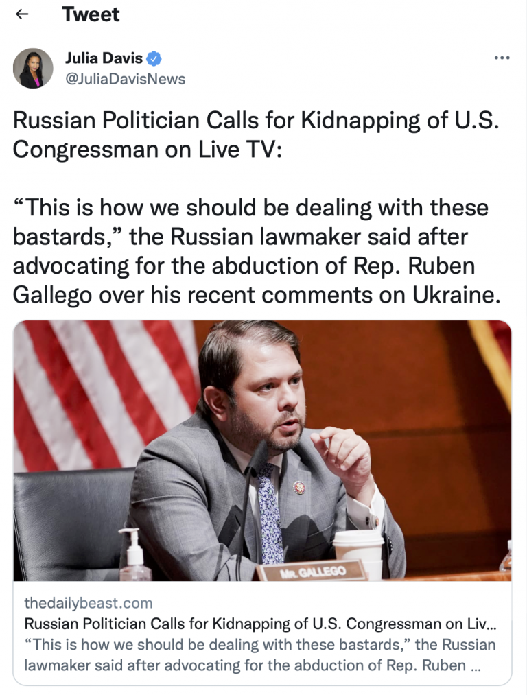 By Tara Kavaler | Arizona Republic Rep. Ruben Gallego reacted defiantly Wednesday after a Russian statesman threatened him with kidnapping on television. “F— around and