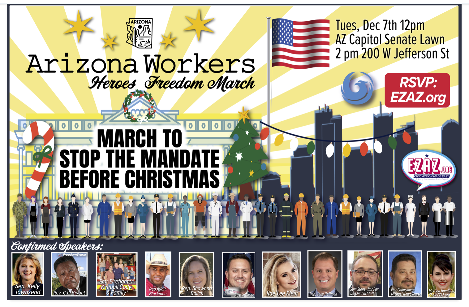The rally was the Arizona Workers and Heroes March to End Mandate by Christmas. It began on the Capitol lawn and ended with a march to the Phoenix City Hall where people demonstrated during the city’s policy session. More than 250 people gathered with signs like “Job or Jab is No Choice,” and “The ‘Safety Measures’ Do More Harm Than COVID.”