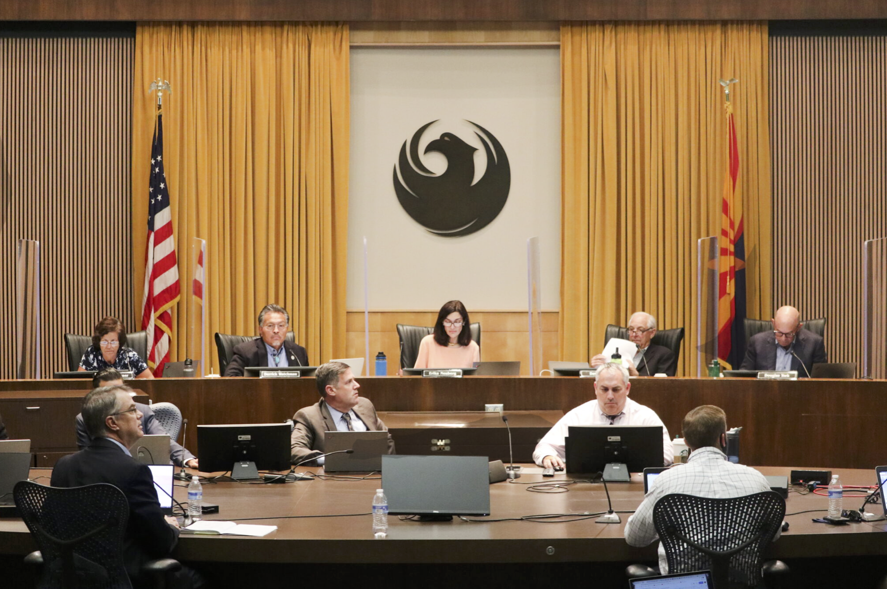 Members of the Arizona Independent Redistricting Commission met Oct. 4, 2021, in the Phoenix city council chambers to discuss initial changes to the grid maps approved the previous month. L to R: Shereen Lerner, Derrick Watchman, Erika Neuberg, David Mehl, Douglas York./ Photo by Jeremy Duda /Arizona Mirror