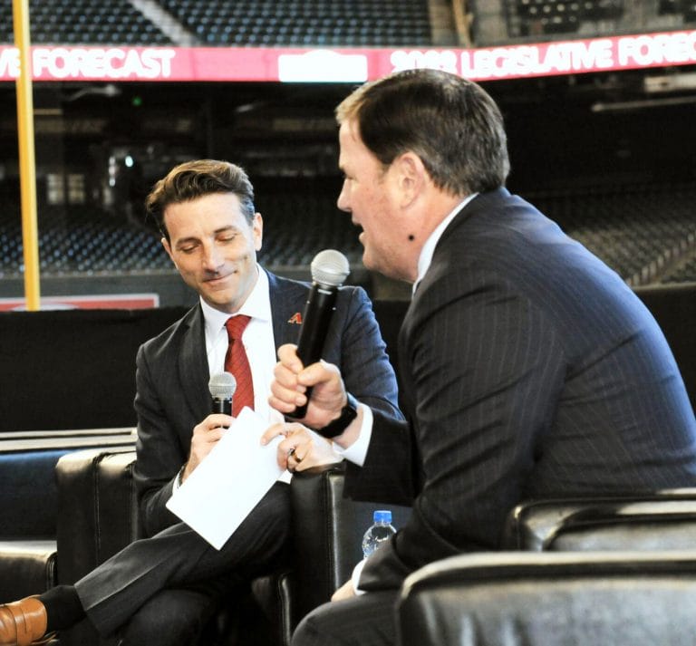 Gov. Doug Ducey chats Friday with Danny Seiden, president of the Arizona Chamber of Commerce and Industry, giving some hints of what he intends to