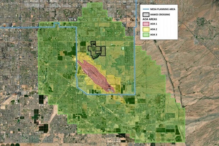 The entire 1,131-acre Hawes Crossing master planned community is surrounded by Air Operations Areas that are shaded in three different colors based on the impact