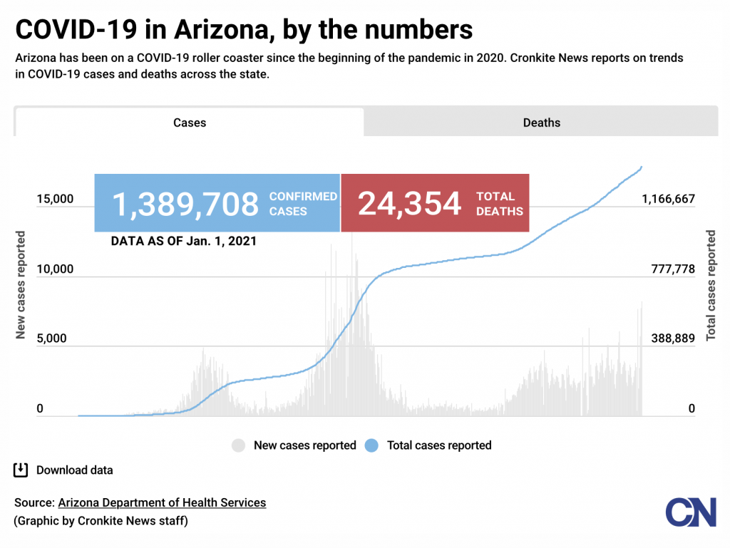 The Arizona Department of Health Services reported an unofficial total of 24,229 COVID-19 deaths in the state as of Dec. 31. With 8,430 of those deaths coming in 2020, according to a preliminary state report on vital statistics for that year, that would leave 15,799 deaths from COVID-19 in 2021.