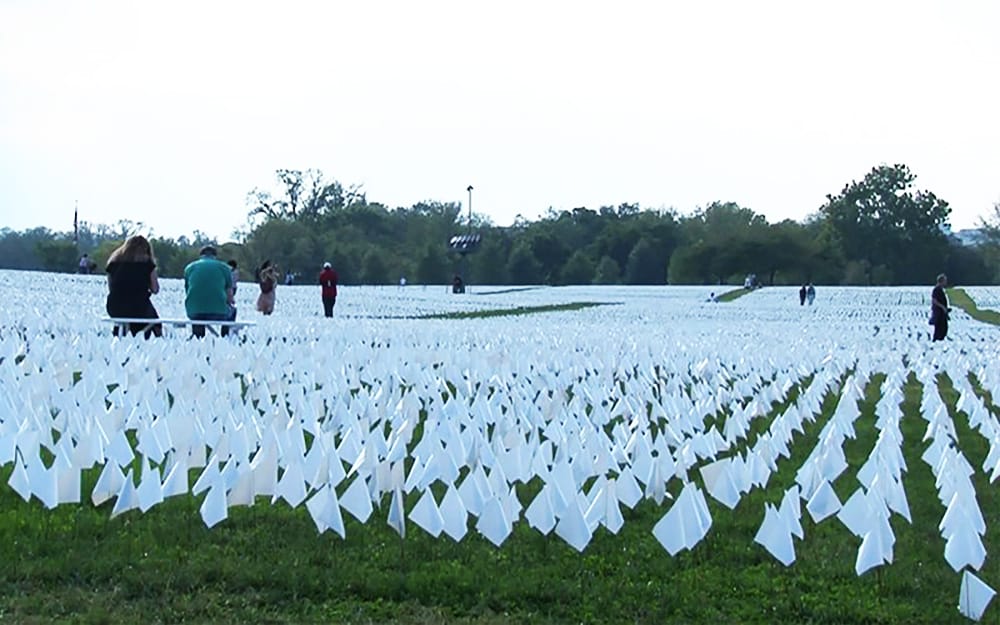 Washington visitors ponder a field of almost 690,000 flags, one for every U.S. COVID-19 death since the pandemic began, in late September, when Arizona’s death toll was nearing 20,000. Since then, the U.S. death toll has climbed over 820,000 and the Arizona death toll hit 24,229, likely making COVID-19 the leading cause of death in the state in 2021. /File photo by Kimberly Silverio-Bautista/Cronkite News