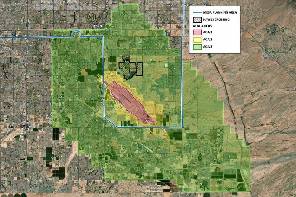 The entire 1,131-acre Hawes Crossing master planned community is surrounded by Air Operations Areas that are shaded in three different colors based on the impact of flights to and from PHX Mesa Gateway Airport. Photo via City of Mesa