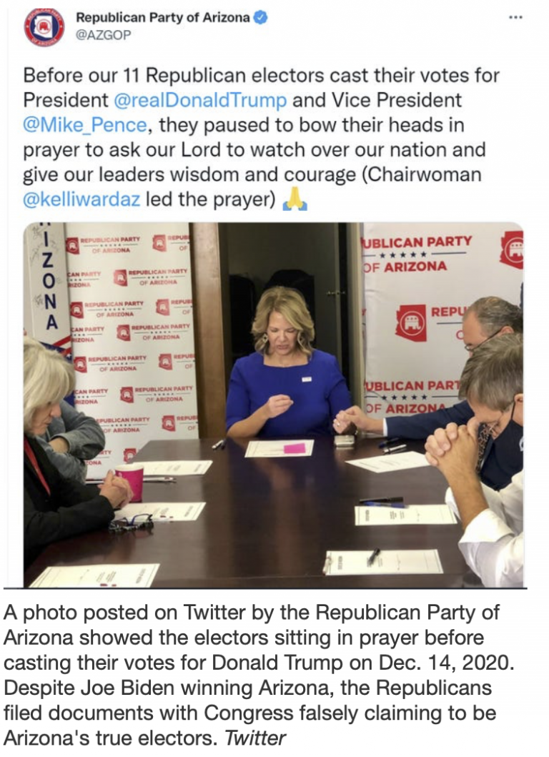 A posting on Twitter from the Arizona Republican Party on Dec. 14, 2020, showed the Republican electors meeting to cast their votes for Donald Trump,