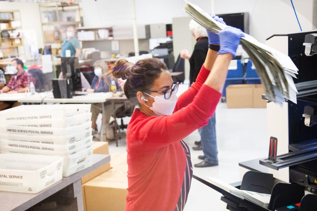 Votes are counted by staff at the Maricopa County Elections Department office on Nov. 5, 2020./ Photo by Courtney Pedroza | Getty Images