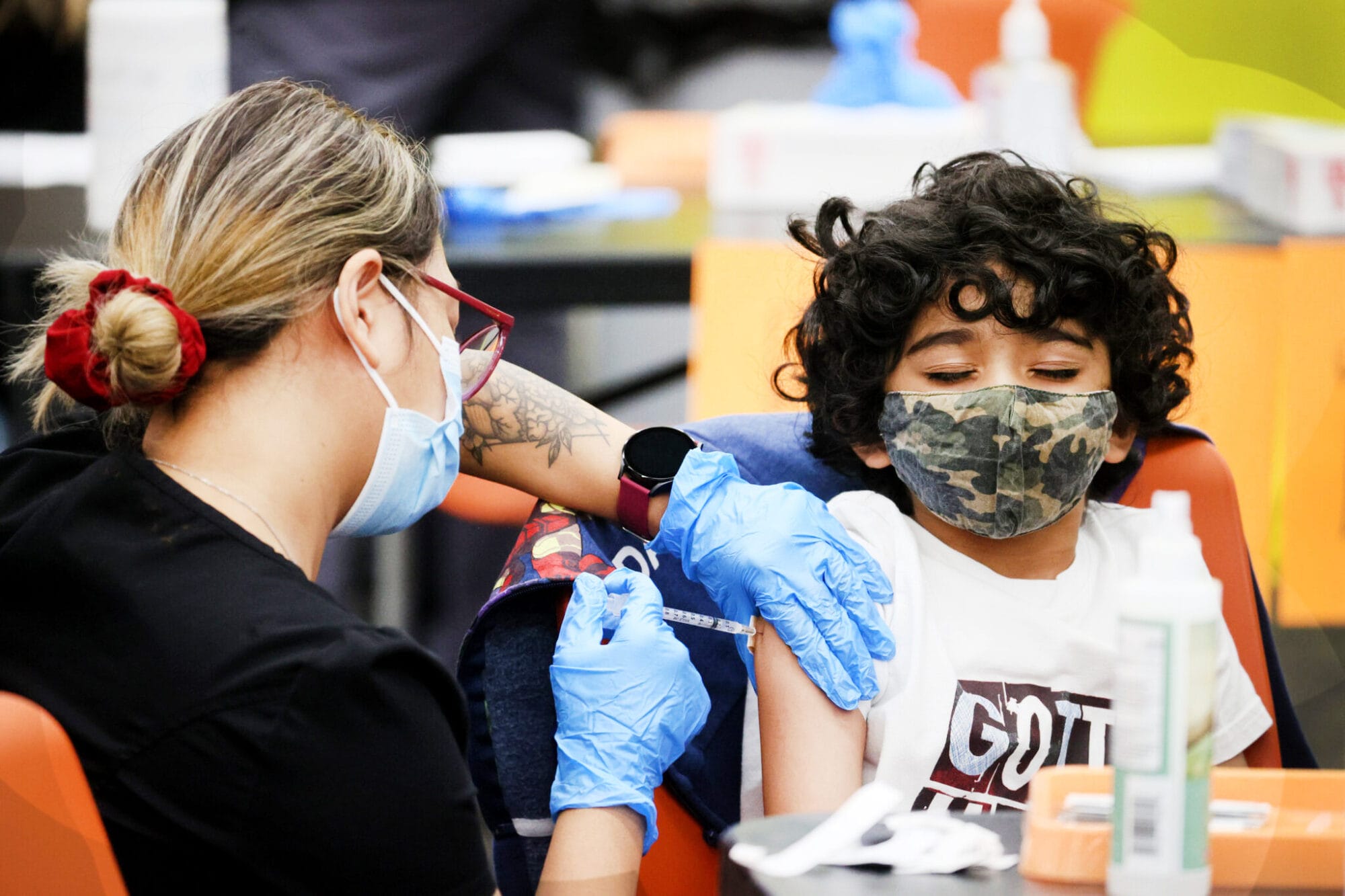 Seven-year-old Milan Patel receives a COVID-19 vaccine at Michele Clark High School on Nov. 12, 2021, in Chicago. /Photo by Scott Olson / Getty Images