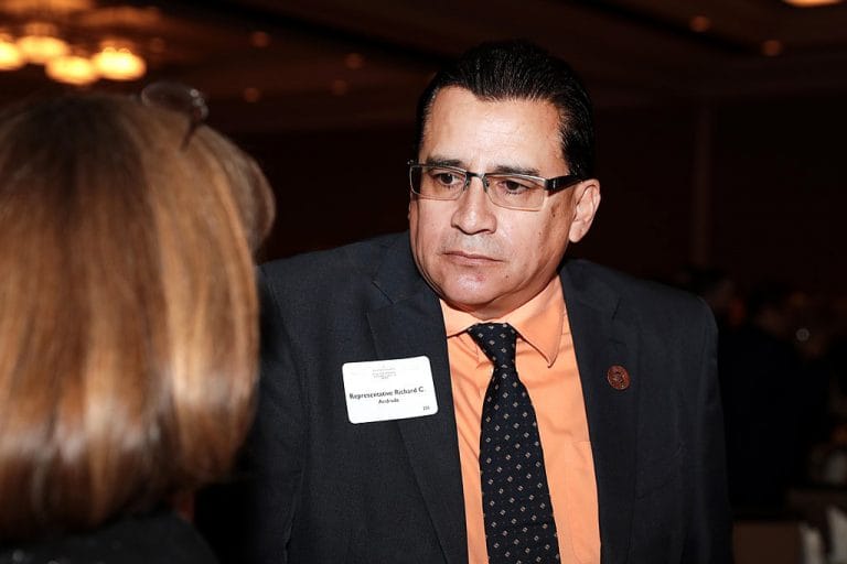 State Representative Richard Andrade, D-Glendale, speaking with an attendee at the 2019 Legislative Forecast Luncheon hosted by the Arizona Chamber of Commerce & Industry at