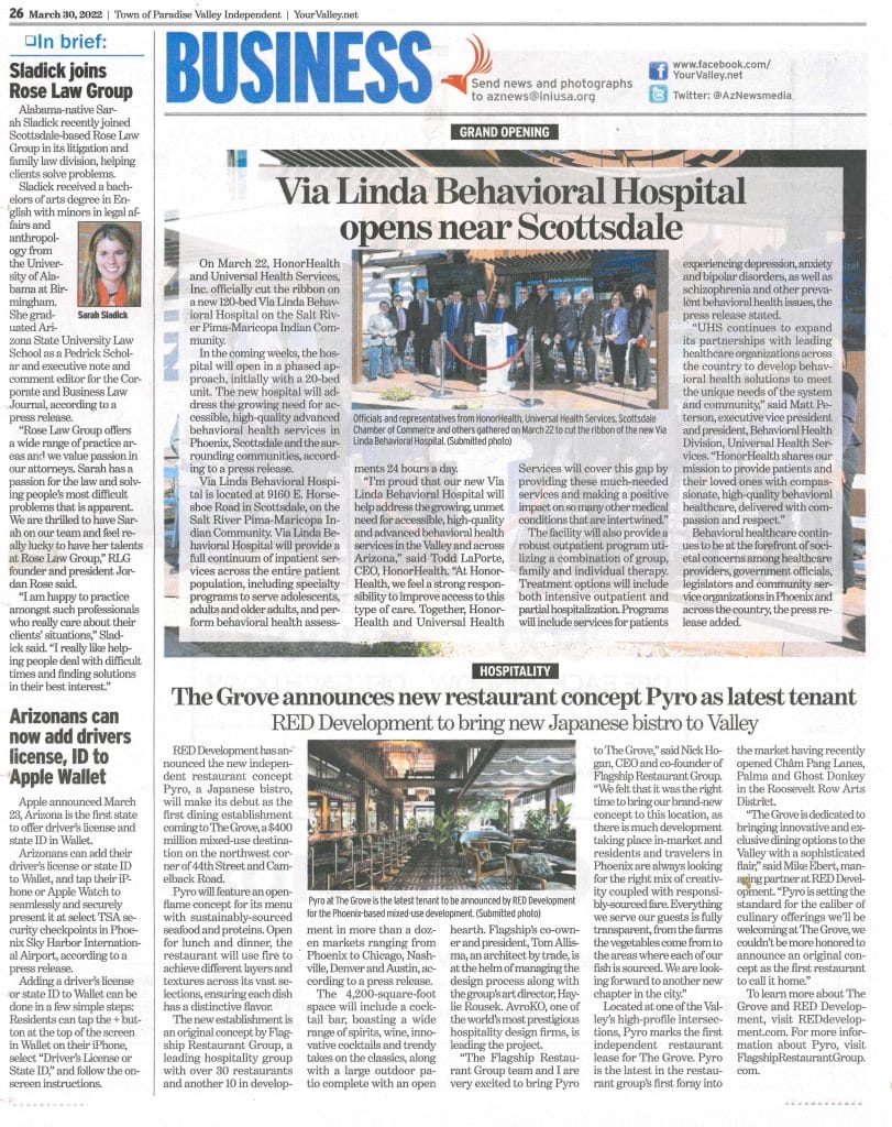 “Rose Law Group offers a wide range of practice areas and we value passion in our attorneys. Sarah has a passion for the law and solving people’s most difficult problems that is apparent. We are thrilled to have Sarah on our team and feel really lucky to have her talents at Rose Law Group,” RLG founder and president Jordan Rose said.