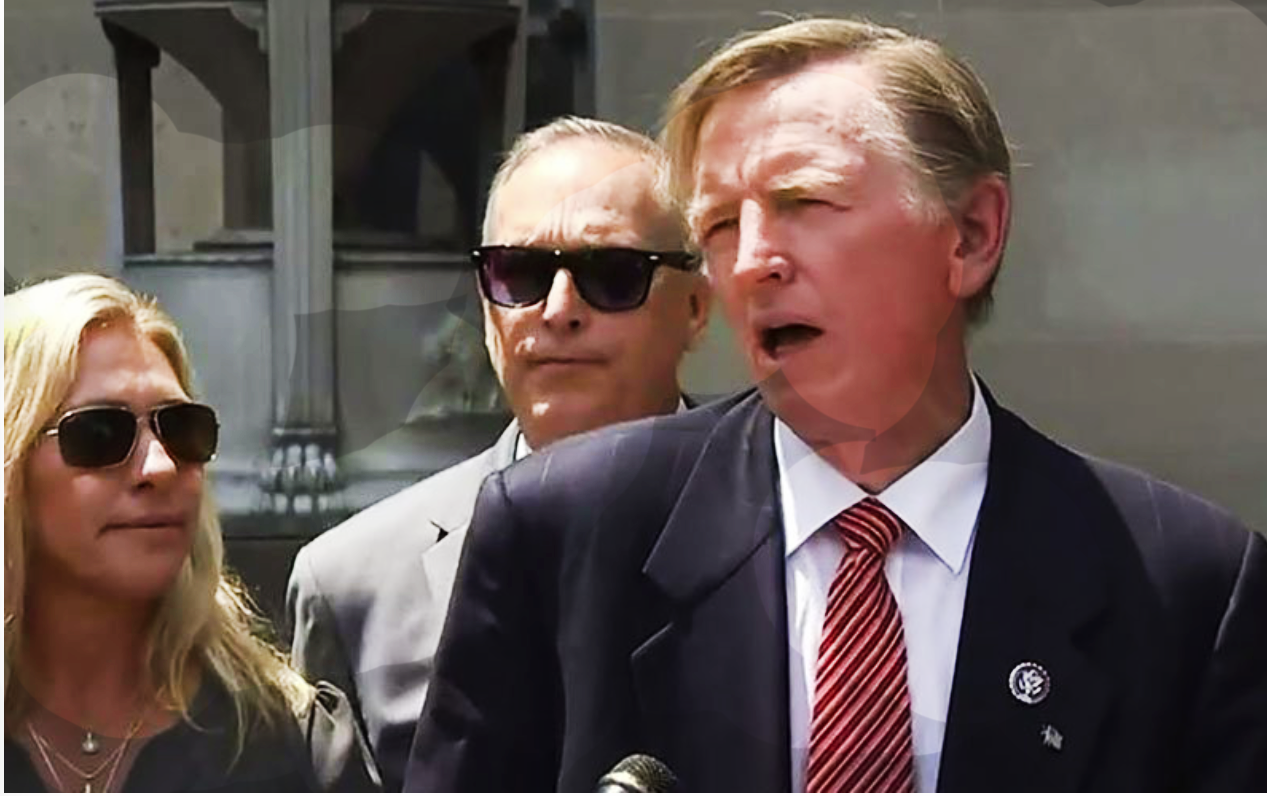From left, GOP Reps. Marjorie Taylor Greene of Georgia and Andy Biggs and Paul Gosar of Arizona, at a July 2021 event where they said defendants in the Jan. 6 attack on the U.S. Capitol were “political prisoners.” The House members are among five lawmakers, including Arizona Rep. Mark Finchem, R-Tucson, whose involvement in Jan. 6 has sparked lawsuits charging that they should be disqualified from the ballot. /Photo courtesy C-SPAN
