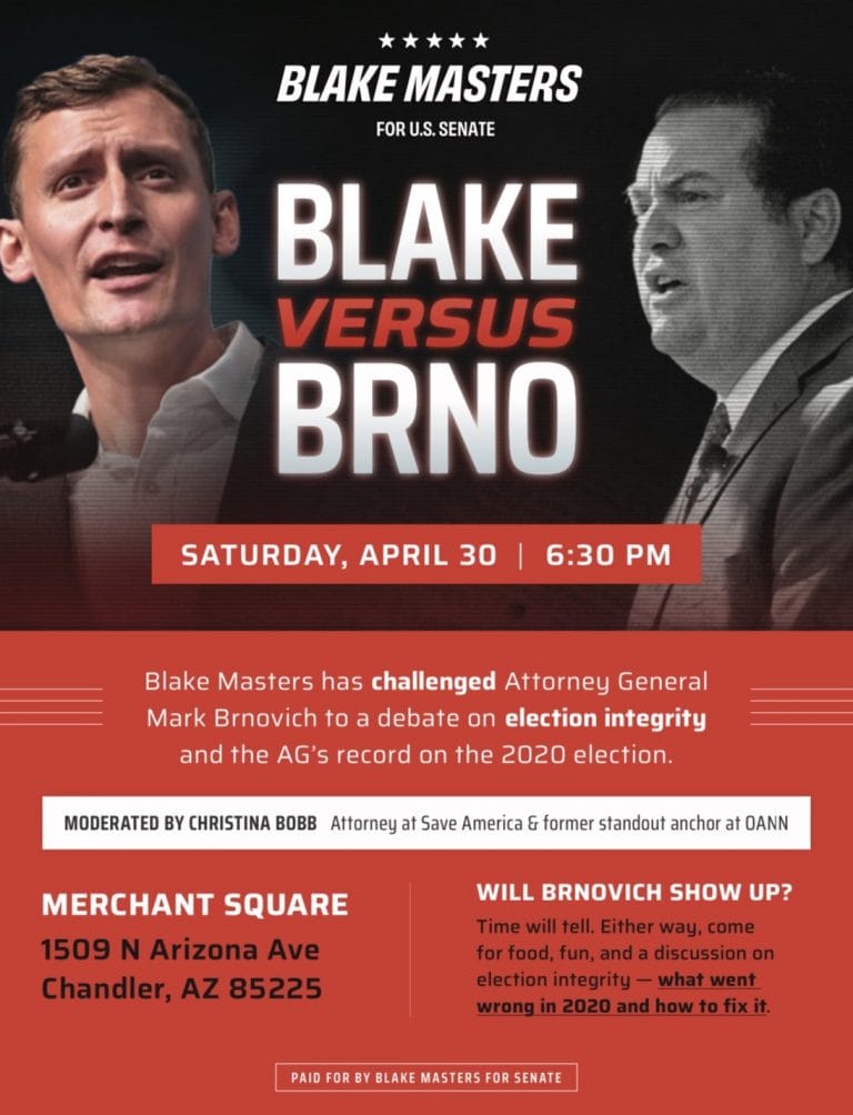 Masters is promoting an April 30 event in Chandler. By Yvonne Wingett Sanchez| Arizona Republic Republican Senate candidate Blake Masters is challenging Arizona Attorney General
