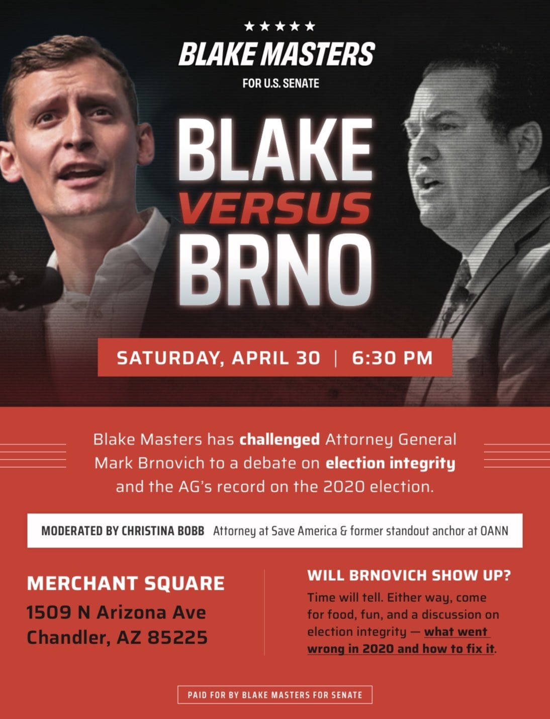 Republican Senate candidate Blake Masters is challenging Arizona Attorney General Mark Brnovich to debate him on election integrity issues as part of an event where former President Donald Trump looms large — and could take part.