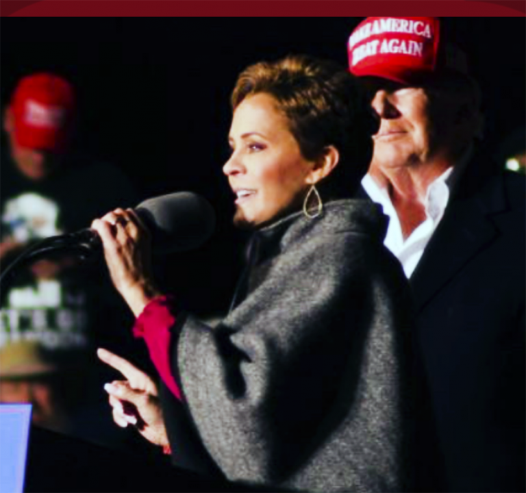 Kari Lake flanked by President Trump/campaign photo By Stacey Barchenger | Arizona Republic Kari Lake descended the stairs inside her Phoenix campaign headquarters toward scores