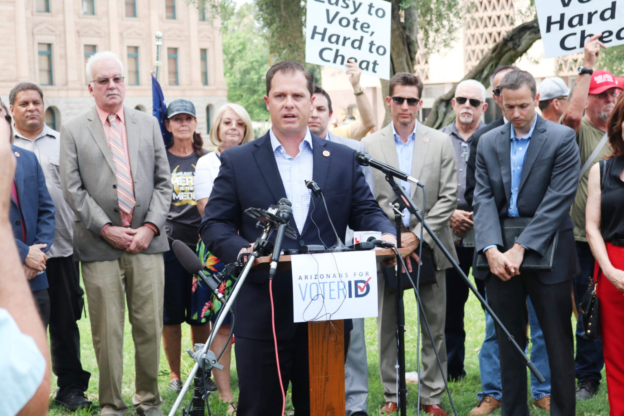 Rep. Jake Hoffman, R-Queen Creek, speaks in support of the Arizonans for Voter ID Act during a press conference outside the Arizona Senate on Aug. 17, 2021. Photo by Jeremy Duda | Arizona Mirror.