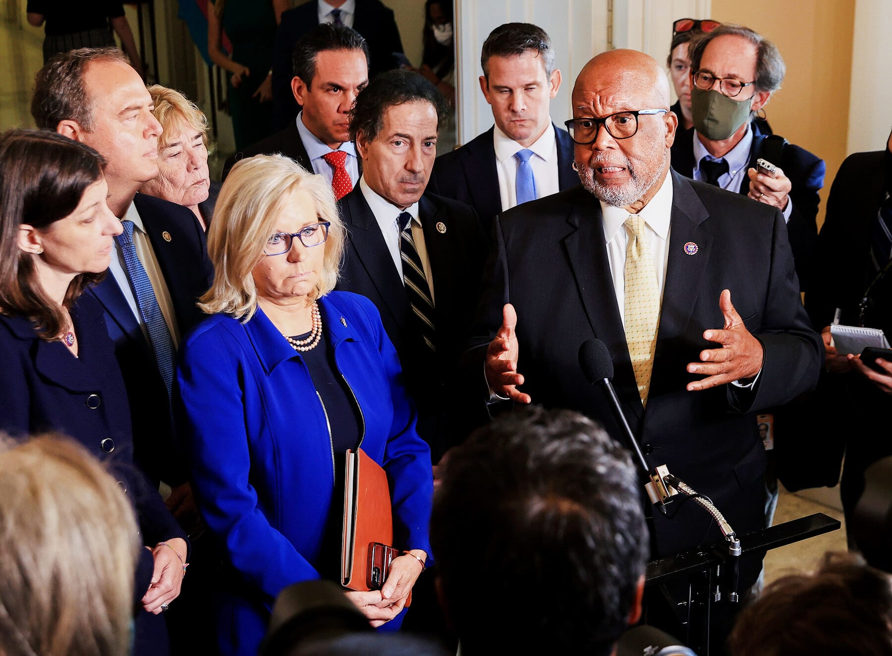 Reps. Bennie Thompson (right) and Liz Cheney, joined by fellow committee members, speak to the media after a July 27 hearing of the House select committee investigating the Jan. 6 attack on the U.S. Capitol. /Chip Somodevilla/Getty Images