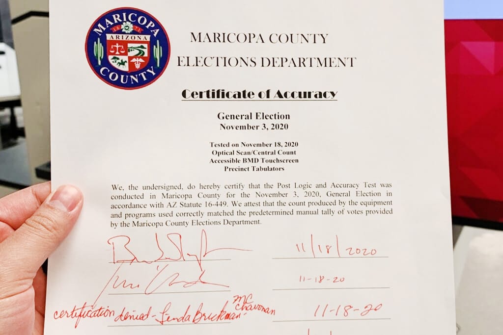 Maricopa County Republican Party Chairwoman Linda Brickman signed the election Certificate of Accuracy but noted “certification denied” next to her signature, which elections officials say is meaningless. Brickman said she did so to help Trump win reelection. /Photo courtesy of Maricopa County Elections Department