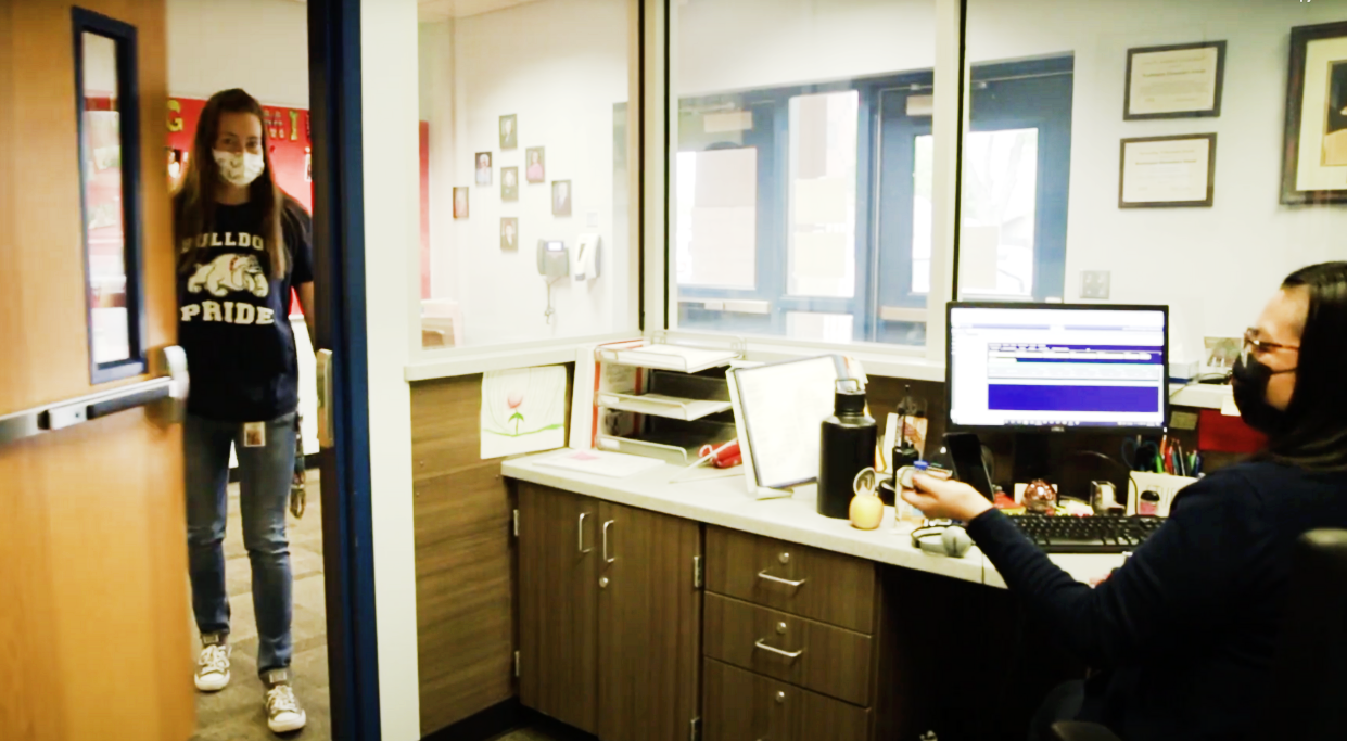 A still from a video released by Mesa Public Schools in December 2021 demonstrates a recently installed secure front entry system at Booker T. Washington Elementary School in Mesa. Visitors must wait until they are buzzed in by an employee. /Mesa Public Sschools