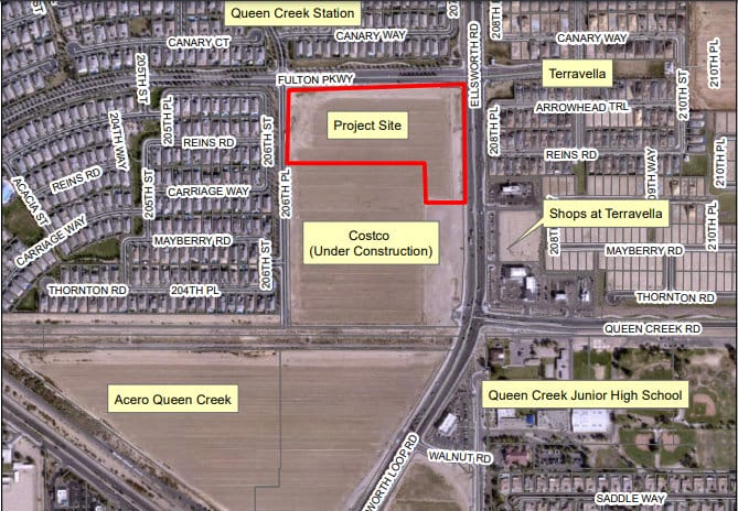 Trish Flower of Upward Architects LLC for site plan and preliminary plat approval of a 12.8-acre commercial center north of Queen Creek Road on the west side of Ellsworth Road adjacent to the future Costco, which is under construction.